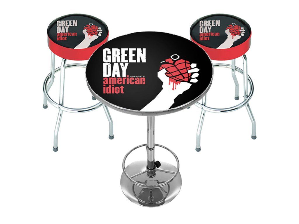Set obsahuje dvě barové stoličky a jeden stůl, vše s potiskem vaší oblíbené kapely.