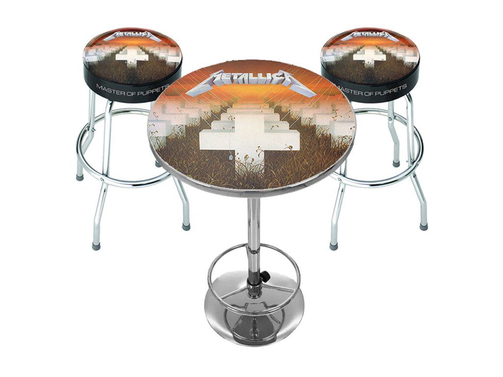 Set obsahuje dvě barové stoličky a jeden stůl, vše s potiskem vaší oblíbené kapely.
