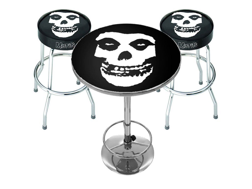 Set obsahuje dvě barové stoličky a jeden stůl, vše s potiskem vaší oblíbené kapely.